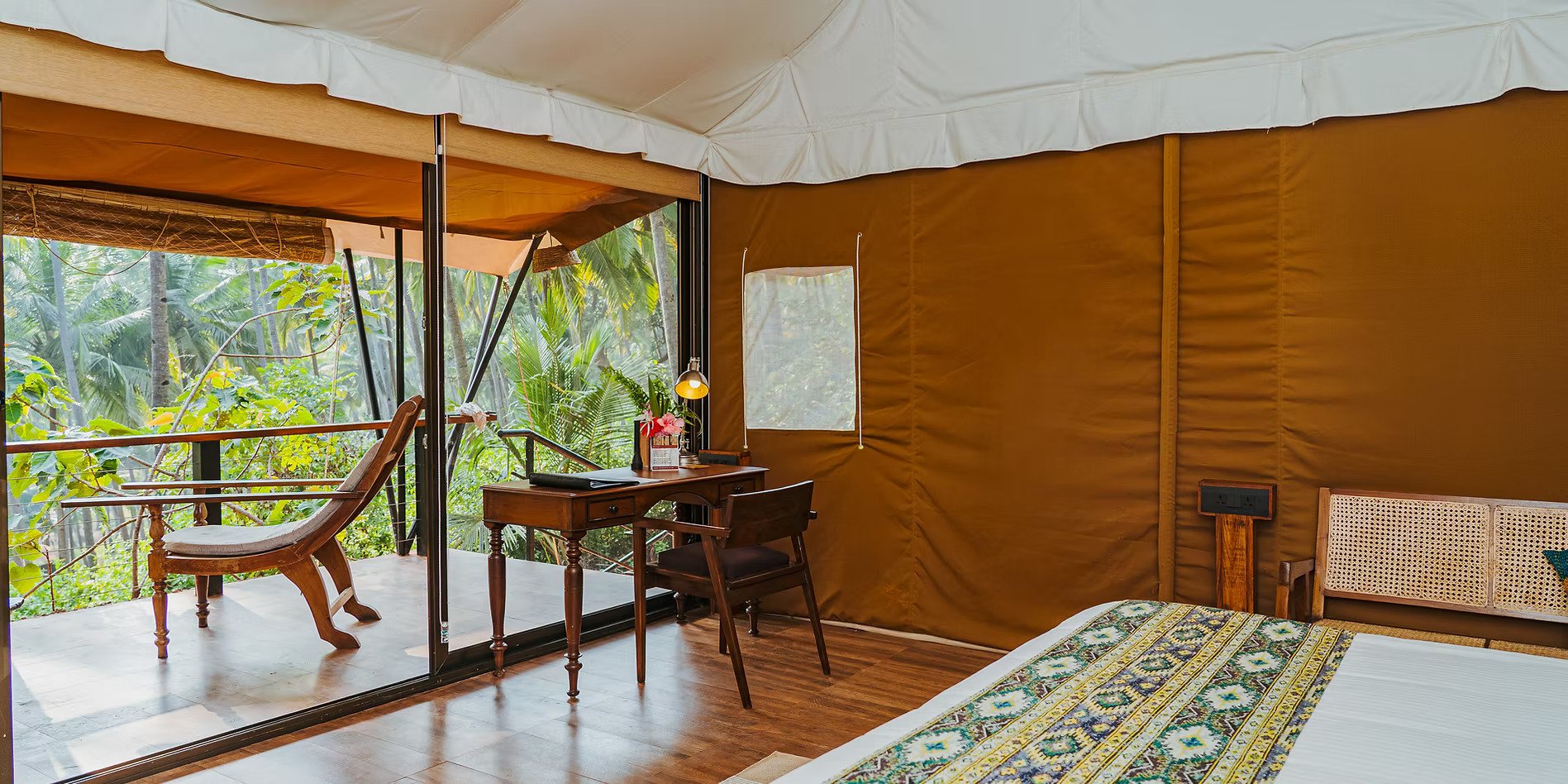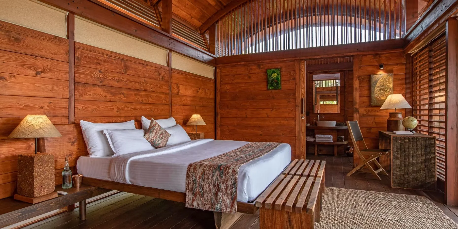 The accommodation is spacious, airy, and luxuriously designed. The rooms are curated to make the most of the tropical sea breeze and the tranquil sound of waves with amenities for highest guest comfort. Each cabin/ tent comes with an expansive deck balcony perched over lush greenery and looking out over the sea.